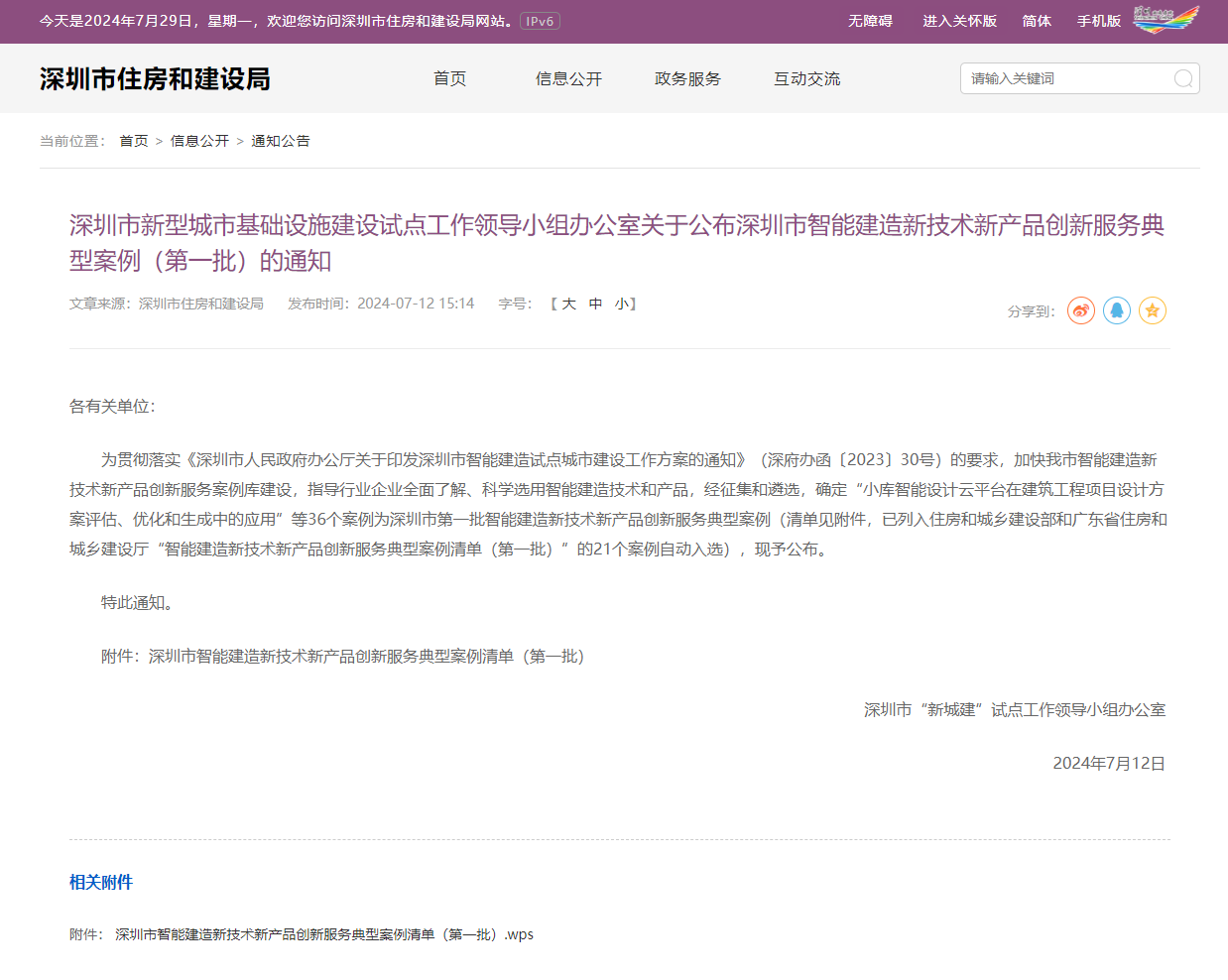 深圳市住房和建設局關于“深圳市新型城市基礎設施建設試點工作領導小組辦公室關于公布深圳市智能建造新技術新產品創新服務典型案例(第一批)的通知”內容——