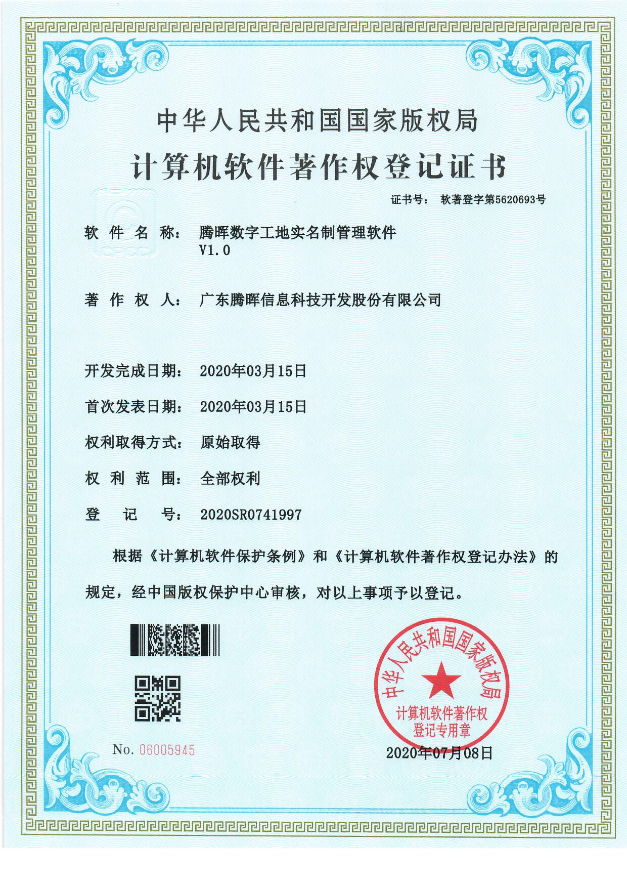 2020年騰暉數(shù)字工地實(shí)名制管理軟件取得國家計(jì)算機(jī)軟件著作權(quán);