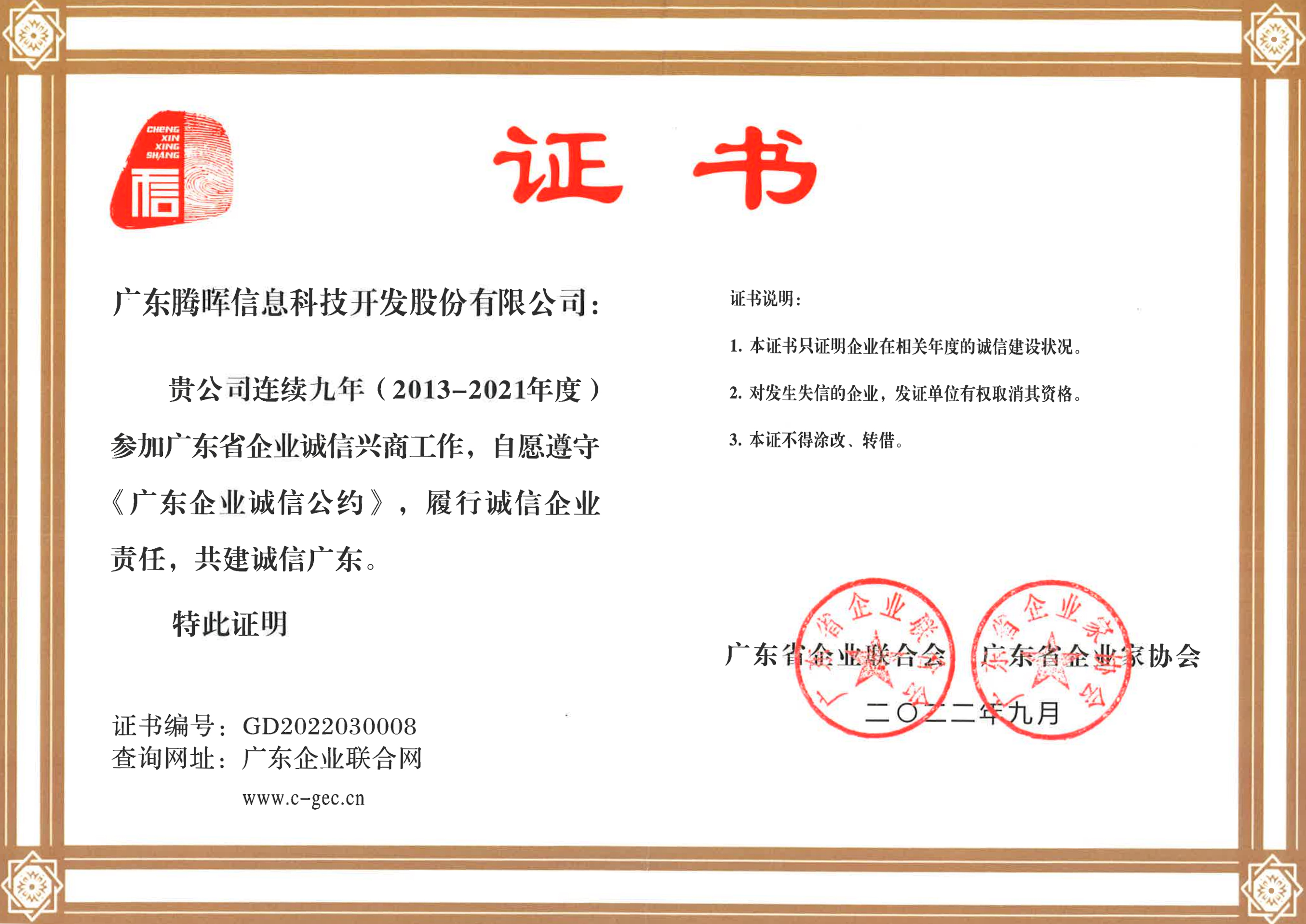 2021年連續(xù)八年榮獲“廣東省誠信示范企業(yè)”;